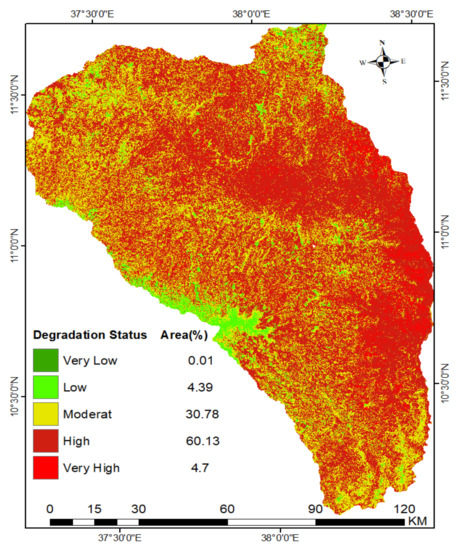 Finally, the annual soil loss was estimated on a cell-by-cell basis of multiplying the five RUSLE factors using Equation (1). As Landsat images and ASTER-GDEM [46] used in this study had 30 m spatial resolution, all the raster maps were resampled to 30 × 30 m cell size and re-projected to UTM Zone 37° N, WGS 1984 datum. The estimated annual soil loss was classified into six severity categories following soil erosion severity classification standards suggested by Haregeweyn et al. and Yesuph et al. [26,96].