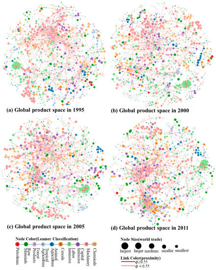 The dynamic global product space from 1995 to 2011. Notes: Each node represents a specific export product. The size of the node indicates the total trade value of the product in the world, and the color of the node represents the product type classified by Leamer classification. Links are color coded with their proximity value.