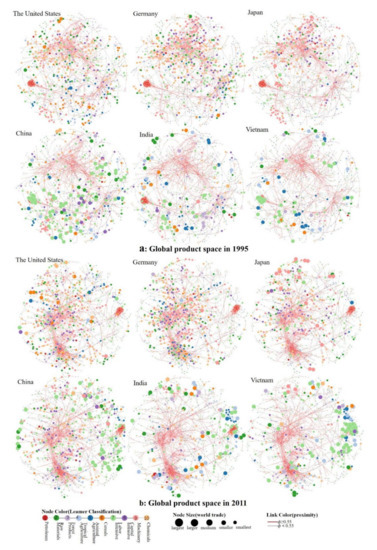 Along with the economic globalization, the trade relations among countries are getting closer, and export is playing an increasingly important role in the world economy. Export upgrading and evolution enhance the international competitiveness effectively, and it has become a popular research topic in recent years. Early mainstream studies on industrial evolution mostly focused on the economic perspective. Factor endowments and technological gap are be considered main factors to affect the countries’ professional development pattern [1,2]. With the emergence of evolutionary economic geography since the 1990s, industrial evolution research has been extended with the geographic perspective [3,4,5]. Evolutionary economic geographers believe that the emerging industries are products of the branching process of existing related industries [6,7,8,9], and industries with cognitive proximity, organizational proximity, institutional proximity, social proximity, and geographic proximity on a macro-scale are more likely to drive each other [10,11,12,13]. Industrial upgrades include the development of new products and the improvement of original products with added value [14]. The spillover effect of this industrialization process is of significance to the sustainable development of the economy [15,16]. In recent years, “Product Space” [17] provides a new network perspective for geographers to study the product evolution, which has made breakthroughs in theoretical research and empirical methods of industrial upgrading. In the past, scholars of international trade networks mainly discussed the trade relations between economies under trade agreements [18]. Most of them take economies in international trade as the object and depict the international trade network by building a trade economic model. In their trade networks, nodes always represent countries and lines represent trade agreements. They focus on the impact of bilateral relations among trading countries, symmetry, policy tariffs [19,20], social factors [21], and geographical distance [22] on global trade links, trade liberalization, international research, and development collaboration, and the stability of international trade networks [23,24]. Different from the above-mentioned trade network theory, the product space theory does not take enterprises or economies and countries as the research object but falls to the micro-product level, focusing on specific trade products in the trade market and the strategic position and competitiveness of the economy in global trade. Product space theory proposed outcomes-based proximity between products at a micro-scale to measure their correlation and evolution path quantitatively. Proximity is measured by the minimum probability of two advantaged products being exported together by the same country, which is a co-occurrence concept and means the higher the proximity of two products in the product space, the easier for one country to export one product to the other. The product space theory can study and visualize scientifically the proximities of products, global trade links, and export status of different countries in the product space [17,25,26].