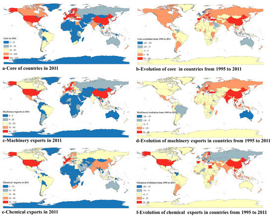 Figure 4 shows the evolution of core, machinery exports, and chemical exports of all countries from the year 1995 to 2011 in global trade. In the map visualization, a very few countries or islands that do not appear in the global customs data are regarded as not carrying out export trade, and the corresponding index is regarded as zero. We can see that the developed countries in Europe and America are at the forefront of the core location, machinery, and chemicals export. Although developing countries in Asia and Africa have no leading position in the export core location and export types, they show a positive upward trend. A small number of African, undeveloped countries have always been at the bottom level in these aspects, and their evolution process is slow.
