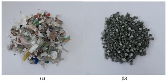 Plasmix sample: (a) Plasmix “as is”; (b) Pellets of Plasmix after extrusion and granulation.