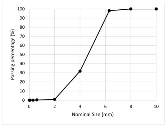 Table 4 provides the physical and mechanical characteristics of the aggregates used, while Table 5 details the gradation of the different fractions of aggregate used. Considering the typical requirement for wearing courses in the Italian technical specifications also given in Table 4, the aggregate fractions selected are adequate for use in wearing courses in urban roads and rural roads belonging to the secondary network, with limited heavy vehicle traffic volume.