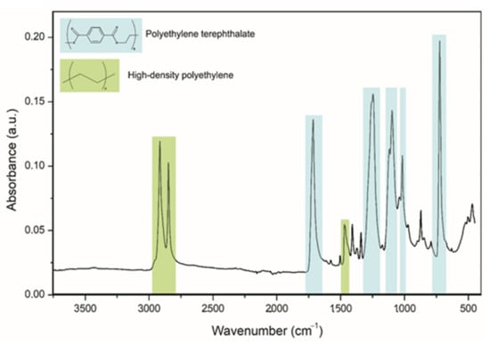 For evaluating the chemical structure of Plasmix, a Fourier transform infrared spectroscopy—attenuated total reflectance (FTIR–ATR) was performed, using a PerkinElmer’s Spectrum Two, which detects the percentage absorbance as a function of the wavelength in thin films with a thickness of 100 microns in a range of 450–4000 cm−1. The instrument was equipped with a diamond (1 Reflection) ATR crystal. The spectrum was collected at room temperature, with a resolution of 4 cm−1.