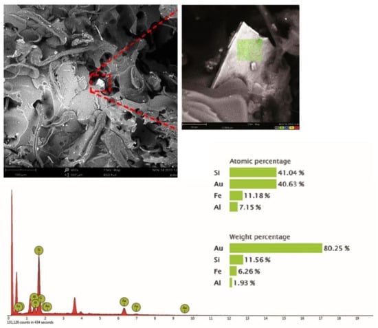 In terms of components, the largest amount is detected for silicon (Si) and gold (Au) with an atomic concentration of 41.04% and 40.63%, respectively; also present, but less representative, there are aluminum (Al) and ferrous components (Fe), detected at 7.5% and 11.18%, respectively, in terms of atomic percentage. It is reasonable to conclude that, amongst the components of Plasmix, some plastic material used for the construction of electronic circuits can be found.