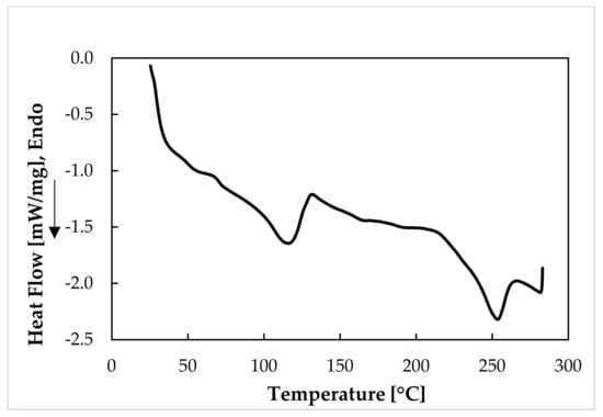 DSC tests were carried on different samples of materials; again, test results proved a good repeatability. The results of the DSC test are shown in Figure 5. DSC tests were carried out on five different pellets of extruded Plasmix, having an average weight of about 8 mg. The testing protocol involved two heating ramps from 40 to 290 °C and a cooling ramp from 290 to 45 °C between them, at a constant heating and cooling rate of 20 °C/min, for investigating the melting and crystallization behavior of the Plasmix. Thermograms obtained by the different replicates were reasonably reproducible. Figure 5 shows a representative result and it can be noticed that the heating cycle shows two main peaks, one around 115–130 °C and one around 253 °C. A small peak around 166 °C is also found. These melting temperature values confirm the presence of various polyethylene (LDPE, LLDPE and HDPE, PP and PET).