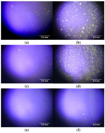 Micrographs of the plastic/bitumen blends after production and after storage at high temperature: (a) 2% Plasmix 50/50; (b) 5% Plasmix 50/50; (c) 2% Plasmix 50/50 after storage—TOP; (d) 2% Plasmix 50/50 after storage—BOTTOM; (e) 5% Plasmix 50/50 after storage—TOP; (f) 5% Plasmix 50/50 after storage—BOTTOM.