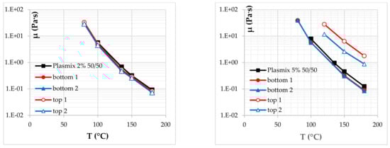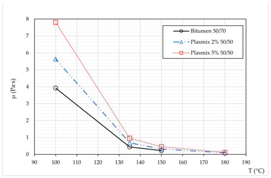 As can be seen from Figure 7, the viscosity of the plastic/bitumen blend increases with the content of Plasmix 50/50, as expected, in line with the results of the empirical tests, i.e., the increase in softening point and the decrease in penetration, given in Table 7 and previously discussed. This increase is beneficial for the resistance (stiffness) at high temperature, which is particularly of interest in regions with warm climate, such as those in the Mediterranean area.