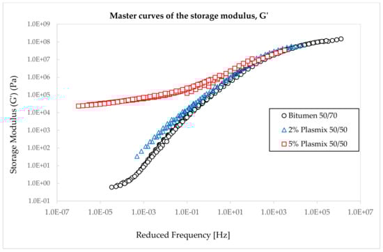 The bitumen modified with the 2% of Plasmix 50/50 does not exhibit a significant increase in elastic component, at the high testing frequencies (low temperature), but this increase became more appreciable at low frequencies (high temperature) []; this behavior is favorable, since the material is not too rigid at low temperature, but it proves a higher stiffness at low temperature (thus offering a higher resistance to the loads). The blend modified with the 5% of Plasmix 50/50 shows a much more elastic behavior than the blend modified with the 2%, so that at very low frequencies—i.e., high service temperature—a plateau is reached, much higher than the corresponding one of the neat bitumen, that tends to zero.