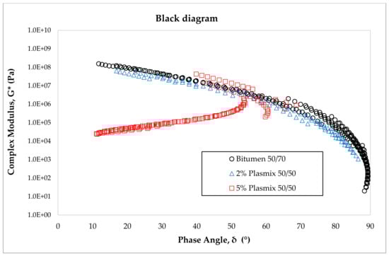The same results obtained during the frequency sweep tests at different temperatures can be directly plot in terms of Black diagrams (norm of G* vs. phase angle), as given in Figure 10, with no need to invoke the TTSP. In this graph, the effect of Plasmix content is clear: at 2% of Plasmix 50/50, the behavior is still very similar to that of the neat binder, even if slightly shifted toward lower values of the phase angle (slight increase in elastic behavior). The addition of 5% of Plasmix 50/50 leads to a real modification of the binder, with a substantial change of its rheological behavior; the relevant increase in elastic behavior is proved by the decreased phase angles, with a plateau region typical of the formation of a polymer network in the blend []. Furthermore, the TTSP is not valid for the blend with 5% of Plasmix 50/50 as it does not have a unique curve in the Black diagram. This evidence is known for Polymer Modified Bitumen (PMBs) as the Partial Time–Temperature Superposition Principle (PTTSP) [] since shifting procedures give continuous master curves as the one depicted in Figure 9.