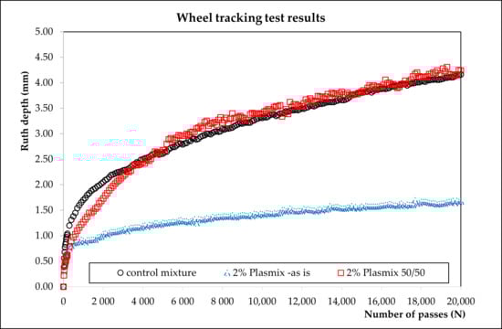 For evaluating the feasibility of the use of Plasmix as additive in the mixture via dry method, as clarified in the Materials and Methods section, it was considered appropriate to focusing on the resistance to permanent deformation of two dry mixtures: one with the 2% of “as is” Plasmix, and a second one with the 2% of Plasmix 50/50 processed by extrusion and granulated. The selected dosage in additive (2%) is typical of this application and production in the laboratory of the dry mixtures was successful, while the 5% of Plasmix 50/50 was not tested since this amount of waste plastic proved to be excessive during production of the mixture, with negative effect on the surface characteristics of the compacted samples (severe bleeding and excessive surface smoothness).