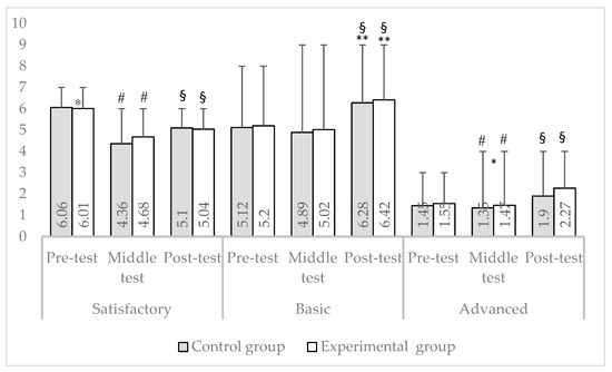 Mathematics diagnostic progress tests. * p ≤ 0.05, the difference between the control and the experimental groups; # p ≤ 0.05, differences between the pre-test and middle-test; § p ≤ 0.05, differences between the middle- and post-test; ** p ≤ 0.05, the differences between the pre-test and post-test.