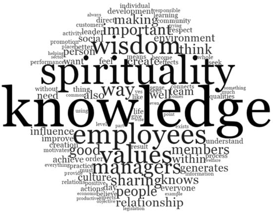 The position and size of the word are related to its repetition and closeness in the answers. Knowledge is in the center of the figure, and the words near are the actor in the company (employees, members, team, managers, and people) and action words (give, influence, improve, creation, achieve, provide, generates, and understand). Spirituality is above with more philosophical words around (feel, want, means, sense, seek, connects, and way). Wisdom is the most significant word displayed above spirituality and has words concerning the company’s exterior (environment, social, community, and customers).