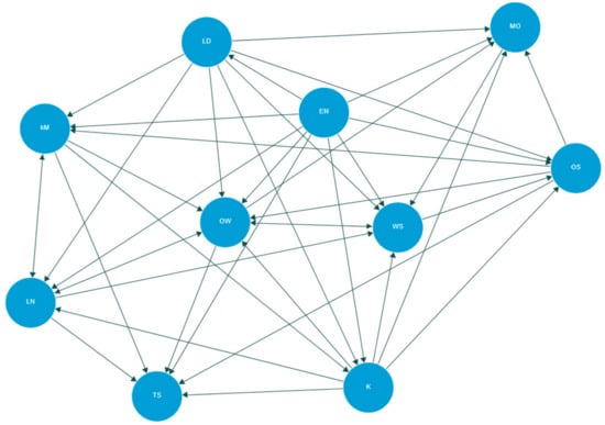 To categorize clusters, we identify them based on the constructs that are part of the codification: 1. Leadership (LD); 2. Transformation (TS); 3. Environment (EN); 4. Learning (LN); 5. Workplace spirituality (WS); 6. Organizational spirituality (OS); 7. Knowledge (K); 8. Practical wisdom (PW); 9. Marketing-orientation (MO); and 10. Knowledge Management (KM). Figure 2 displays the connection between the clusters.