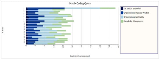 Organizational practical wisdom presents a strong positive correlation with organizational spirituality and a moderate correlation with knowledge management. This positive correlation signifies that the variables move in the same direction. In contrast, there is no significant correlation between knowledge management and organizational spirituality (Table 2). The moderate correlation between organizational practical wisdom and knowledge management results from the interviewee’s shortage of theoretical expertise concerning the constructs. Rocha and Pinheiro’s [] theoretical framework of organizational practical wisdom defends a moderator effect of organizational spirituality in the relationship between knowledge management and organizational practical wisdom. Nevertheless, NVivo does not analyze that kind of effect. Figure 3 is the result of a correlation between ≤1 and ≥0.5 (Table 2).