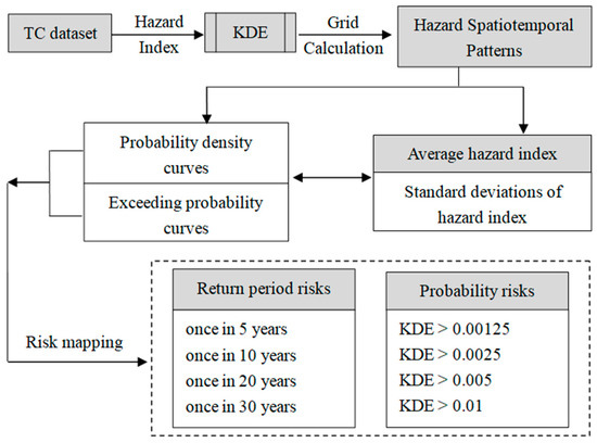 We used the CMA TC database to select the southeastern coastal area of East China as our research area. The data for various typhoon elements between 1949 and 2018 (a total of 70 years) was statistically processed and the paths that landed in China were assessed. We used the KDE as the hazard index; thus, the probability of exceeding, or reaching, return period or exceeding a certain threshold was used to describe the probability of hazard occurrence.