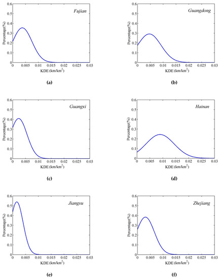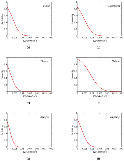 The KDE index of 70-year typhoon hazard factor was selected as a sample while 0.005 was determined as the interval length of each histogram. A histogram was then estimated for each evaluation unit to enable us to calculate probability and exceeding probabilities. Larger values of the search radius parameters produce a smoother, more generalized density raster. Smaller values produce a raster that show more detail. The output cell size can be defined by a numeric value or obtained from an existing rater database. By adjusting the parameters and comparing the analysis results, the final search radius parameters is selected as 100km, and the cell size is set as 1km. Thus, for display purposes, based on the annual hazards data samples, annual average KDE indexes for six provinces (i.e., Guangxi, Hainan, Guangdong, Fujian, Zhejiang, and Jiangsu) were calculated. The probability density curves for these hazards were calculated (Figure 2) alongside exceeding probability curves (Figure 3). The probability density curve can include any probability value on the hazard index interval; this enabled us to estimate the probability of different hazard levels. The exceeding probability refers to the chance that the intensity of a typhoon exceeds the intensity of a given event within a certain area and time range. This also reflects the range of hazard risk as well as its changes. Thus, the steeper the probability density curve, the probability of hazard index is greater. The probability of occurrence of this factor is large while the slowly changing section represents a small hazard probability event.
