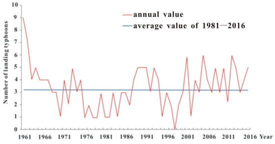 The annual frequency of tropical cyclones generated in the Northwest Pacific including those affecting China has decreased significantly over time. The number of tropical cyclones landing in China has gradually decreased (−0.4 per 10 years), while the frequency of typhoons generated in the Northwest Pacific and the South China Sea has also decreased over time. The frequency of typhoons landing in China has varied greatly year-on-year and the proportion of landed typhoons is increasing. The average number of typhoons that landed in China in the 1990s with wind forces level 12 or higher was 2.8; since 2000, this number has been 4.1, an increase of 46% (Figure 6). From the end of the 1960s to the beginning of the 1970s, the number of landing typhoons was mostly above the multi-year average, and then fluctuated around the multi-year average. From the early 1970s to the mid-1990s, there was a relatively stable fluctuation state. Since the end of the 1990s, there has been a weak downward trend.