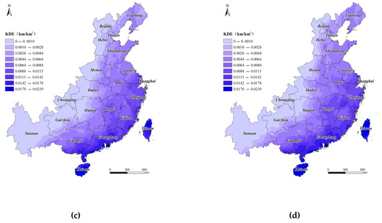 Maps showing probability risks, given different typhoon hazard indexes across China: (a) Kernel Density Estimation (KDE) > 0.00125; (b) KDE > 0.0025; (c) KDE > 0.005; and (d) KDE > 0.01.