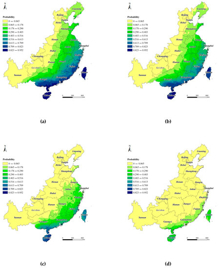 Another type of hazard risk map was generated to calculate the probability of occurrences under different hazard indexes using the exceeding probability of each grid cell. This was then used to draw a corresponding series of risk maps, including four hazard index levels, typhoon hazard index > 0.00125 (Figure 8a), typhoon hazard index > 0.0025 (Figure 8b), typhoon hazard index > 0.0005 (Figure 8c), and typhoon hazard index > 0.01 (Figure 8d).