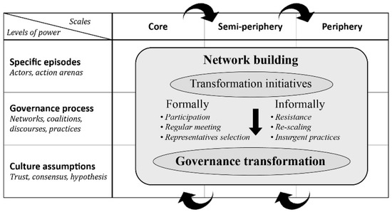 Second, the idea of “network governance” or “governance-beyond-the-state” can fulfill the gap of existing political–economic logic in analyzing the socially and politically constructed urban process. Network governance refers to collaborative decision-making by complicated self-organized and inter-organizational networks, including public agencies and non-state agencies (who are normally marginalized groups) [16,38,39]. This is essentially different from the logic of the market or hierarchy. Governance in this new form can be accomplished either formally, for instance, through regular meetings of selected organizational representatives, or more informally through ongoing (but typically insurgent) practices adopted by people who have a stake in the network’s success [7,40]. In the planning sphere, government-led or outcome-oriented urban (re)development arrangements have proved to be contentious, costly, and inefficient, with strong side-effects concerning the inherited socio-spatial relations such as displacement or gentrification.