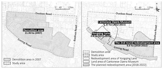 - From 2009 to 2015: In December 2009, a large-scale urban redevelopment scheme named the “Three Old Renewals” (“Sanjiu Gaizao”) was facilitated by the Guangdong Provincial Government in terms of a top-down land-use [33]. The resulting policies highlighted the area-based regeneration approaches, which means that the focus of the redevelopment project expanded from the specific material space to the mixed socio-economic space in a broader area. However, the area-based policy still required large-scale demolition. For instance, in the first demolition plan in 2007 in Enninglu, 82% (115,000 out of 140,000 m2) of buildings that were planned to be demolished were not even identified as “dangerous or dilapidated houses”. These demolition-based redevelopment policies were met with intense social resistance by local communities, historical conservationists, and other social interest groups, as shown in Figure 7.