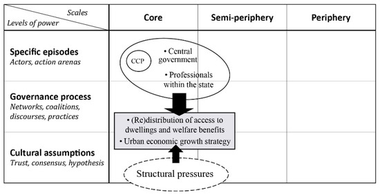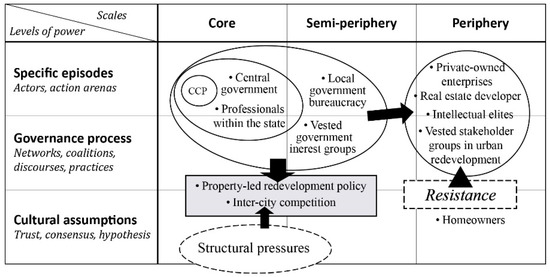 During this decade, the multi-level governments continued the growth-oriented urban (re)development policies. With the deepening of the privatization of housing and the reform of the tax system, land finance became a major financial source for local governments. Especially after Jiang Zemin proposed the idea of the “Three Represents” (“Sange Daibiao”) in the late 1990s, a new change took place in China’s political system, namely the transition from the proletarian dictatorship to meritocracy. In such a system, government measurement is based on its performance, which is measured through examinations or demonstrated achievement [51]. As a result, the hierarchal relationship between the central government and local governments took shape. To accumulate political capital within the inter-city competition, local government officers paid more attention to land development programs. Take Guangzhou as an example, whose resulting policies led to large-scale demolition and reconstruction in the inner-city areas. In the late 1990s, many inner-city neighborhoods in Liwan District were demolished and rebuilt as mixed commercial plazas or high-density residential communities, such as the Liwan Plaza and the Hengbao Huating community. The success of these projects mainly depended on the local-level land readjustment policies, in which local governments integrated previously fragmented land resources and transferred them to real estate developers for land value increments. As a result, the property-led redevelopment policies were institutionalized to support rapid urbanization and real estate development. In this phase, the decision-making power regarding urban (re)development strategy has been transferred from central government to a more vested interest group including local government and private sectors, as shown in Figure 6.