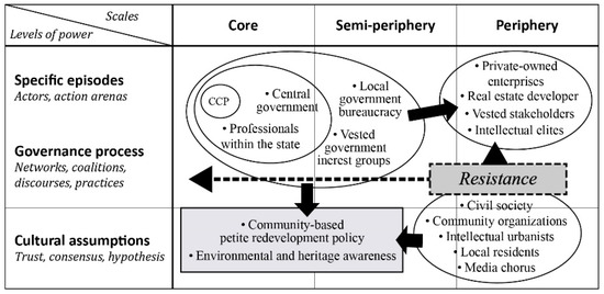 This paper argues that the performance of participatory planning in urban regeneration policymaking ultimately depends on whether decision-making power permeates from the core to the periphery of the network, as shown in Figure 1. When narrowing this down to examine the area-based governance arrangements that involve multi-scalar interactions, the analytical framework in Figure 1 can be useful. Based on the theories of Healey [15] and Coaffee and Healey [41], this framework contains three levels of power. The first level is specific episodes in which interactive practices take place in different action arenas. At this level, the most important question is to identify the key actors and their action arenas. In this study, the initiatives at the episode level refer to the insurgent actions taken by local community oppositions. The second level is the governance process, which focuses on the mutual relationship of these actors and their performances in terms of insurgent initiatives. In this study, the evolution and formation of governance networks and coalitions will be analyzed in terms of stakeholder-based practices and discourses. The third level is the cultural assumptions held by different social groups about urban agendas or governance practices. This level focuses on the legitimation and impact of the episodes and governance processes. This is the reformulation and reconfiguration of inherited structures, such as the authority of rules, the justice of resource allocations, and the inclusiveness of accountability. In this regard, this study argues that the formulized networks and coalitions are based on a high degree of trust and resonance with cultural assumptions.