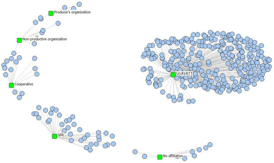 The farmers grouped according to the type of organization are shown in Figure 1 (two-mode network). The GGAVATT farmers showed more homogeneous groups with well-defined structures, reluctant to technological exchange with other farmers external to their group. On the contrary, the SPR farmers were a smaller group, more heterogeneous and closer to the other associations. The GGAVATT and SPR farmers showed a higher level of technology adoption and a higher degree than the rest of the organizations (Table 4).