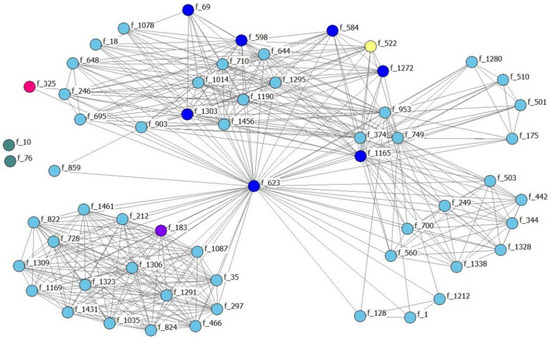 The dual-purpose farmer’s network in reproductive management, coloured by organizations, are presented in Figure 2. In this innovation one-mode network, only one central farmer was found with the higher betweenness value and, therefore, with a very high social capital compared to their technological peers. This is the farmer f_623, affiliated to the SPR, the only farmer with an adoption rate of 100%. The network structure highlighted that farmers affiliated to the GGAVATT tend to form homogenous groups. These results corroborate the findings of Rangel et al. [11], who found in the dual-purpose livestock system that while the structural characteristics of the farms were quite heterogeneous, the technological levels were quite homogeneous.