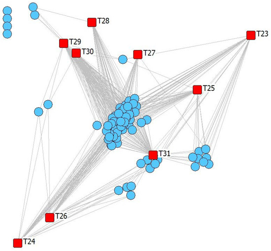 Figure 3 shows the two-mode network relating farmers and technologies. The network structure indicated that some of the reproductive management technologies were jointly adopted: calf selection criteria (T28), female selection criteria (T29) and sire selection criteria (T30). So, they were considered complementary technologies [11]. On the contrary, the technologies “male crosses” (T24) and “female crosses” (T26) followed another adoption pattern. These results also showed that the crossbred system (T31), with an adoption rate of 96%, was the most widely adopted technology. It can be considered an elementary technology in reproductive management. However, the least adopted technologies in this group of farmers were using male breeds (T23), female breeds (T25) and genetically tested bulls (T27), with an adoption rate of 37.34%, 22.45% and 20.10%, respectively.