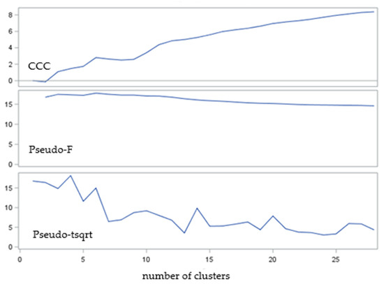 Hierarchical cluster analysis based on minimal Ward variance method was used as a pre-step for k-means clustering. To find an optimal number of clusters pseudo t-sqrt statistic was utilized because Cubic Clustering Criterium (CCC) and pseudo-F were much less informative. According to this measure the optimal number of clusters was set up as five clusters (see Figure 1).