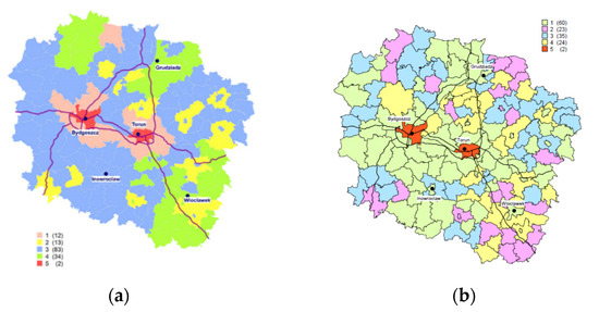 Spatial analysis revealed differences between local units that form distinct clusters. There is also a visible dependence on the urbanization level of regions (see Figure 4). The two largest cities in the region: Bydgoszcz and Toruń sprawl their urbanization effect on the surrounding local units. Distinct local units are also concentrated around the two remaining big cities (Grudziądz, Włocławek) and are mostly urban-rural specific. At the same time, there is a large group of local units, who are weaker economically and more peripheral.