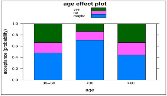 Age. The likelihood to choose acceptance category YES decreases by 0.28 times (the risk or odds is 72% lower) in comparison to category MAYBE, if respondent’s age group is [<30] (p < 0.05). Figure 2 shows the age effect on probability of acceptance.