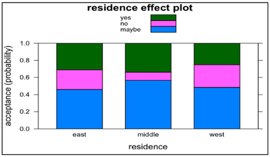 Residence. The likelihood to choose acceptance category NO decreases by 0.33 times (the risk or odds is 67% lower) in comparison to category MAYBE, if respondent’s residence group is MIDDLE (p < 0.05). Figure 4 shows the residence effect on the probability of acceptance.