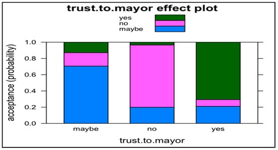 Trust. The likelihood to choose acceptance category YES increases by 18.24 times (the risk or odds is 1724% higher) in comparison to category MAYBE, if respondent’s trust.to.mayor variable takes group YES (p < 0.01). The likelihood to choose acceptance category NO increases by 16.51 times (the risk or odds is 1651% higher) in comparison to category MAYBE, if respondent’s trust.to.mayor variable takes group NO (p < 0.01). Figure 5 shows the trust effect on the probability of acceptance.