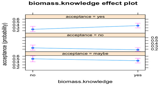 Biomass.knowledge. The likelihood to choose acceptance category YES increases by 1.74 times (the risk or odds is 74% higher) in comparison to category MAYBE, if respondent’s biomass.knowledge is YES (p < 0.1). Figure 6 shows the biomass.knowledge effect on the probability of acceptance.