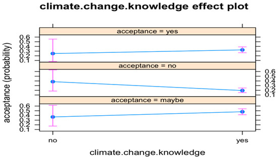 Climate.change.knowledge. The likelihood to choose acceptance category NO decreases by 0.39 times (the risk or odds is 61% lower) in comparison to category MAYBE, if respondent’s climate.change.knowledge is YES (p < 0.1). Figure 7 shows the biomass.knowledge effect on the probability of acceptance.