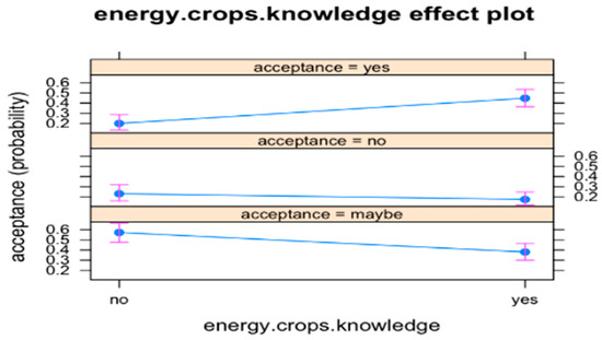 Energy.crops.knowledge. The likelihood to choose acceptance category YES increases by 3.39 times (the risk or odds is 239% higher) in comparison to category MAYBE, if respondent’s energy.crops.knowledge is YES (p < 0.01). Figure 8 shows the energy.crops.knowledge effect on the probability of acceptance.