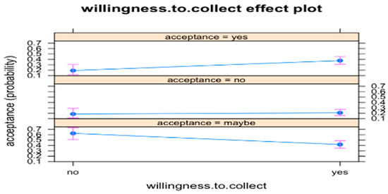 Willingness.to.collect. The likelihood to choose acceptance category YES increases by 2.94 times (the risk or odds is 194% higher) in comparison to category MAYBE, if respondent’s willingness.to.collect is YES (p < 0.01). Figure 10 shows the willingness.to.collect effect on the probability of acceptance.