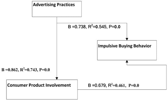 Regression analysis was carried out to model the relationship between advertising practices (online and offline) and impulsive buying behavior. Combined factors (online advertising practices, window display, store display, floor merchandising, and promotional signage) were used in analyzing the construct Advertising Practices. The similarly combined mean of measurement variables was calculated for assessing the “customer product involvement” factor, a combined mean of five measurement variables related to impulsive buying behavior was calculated for assessing “impulsive buying behavior,” and a multicollinearity test of each construct was carried out to analyze model fitness and assess whether multicollinearity is present in the model that may affect our model with more than one predictor. Variance inflation factor (VIF) for multicollinearity was calculated and found to be as follows: online advertising practices (2.779), window display (1.224), store display (1.121), floor merchandising (1.697), and promotional signage (1.772), which are considered to be within the limit (1 < VIF < 5). After assuring multicollinearity, regression analysis was carried out in three steps. In the first step, regression analysis was carried out to assess the direct impact of advertising practices on impulsive buying behavior. In the next step, the impact of advertising practices on consumer brand involvement and the further impact of consumer brand involvement on impulsive buying behavior was calculated using SPSS software. Results are presented in Table 6 and Figure 1.