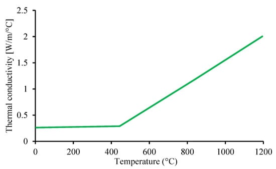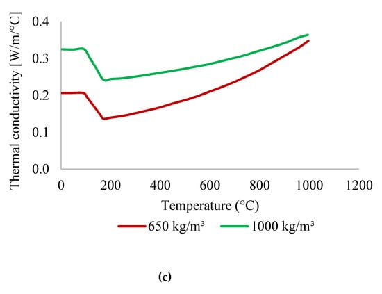 Figure 3a–c shows the thermal properties of foamed concrete at elevated temperatures and Figure 4 illustrates the thermal conductivity variation of Rockwool insulation material. The density and specific heat values of Rockwool at elevated temperatures are 100 kg/m3 and 840 J/kg.°C, respectively [43].