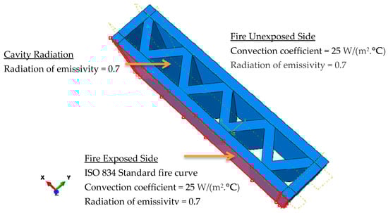Thermal loading and boundary conditions were applied to the FE model in a similar pattern to real fire scenario to represent the actual conditions. All three key heat transfer modes conduction, convection and radiation were considered in the developed 3DPC wall models. Thermal loading to the 3DPC vertical wall surface was applied as the boundary conditions. While applying the ambient temperature of 20 °C as the predefined initial temperature for the entire model, time–temperature variation at the fire exposed side of 3DPC wall was applied to follow the standard fire condition. The heat transfer solid 3D eight-node linear brick element with one degree of freedom per node (DC3D8) was used to ensure the conduction heat transfer occurs through the wall element in the same material. The conduction heat transfer by the air inside the cavity is negligible due to its low thermal conductivity. Moreover, convective film coefficient of 25 W/(m2.°C) was used for fire exposed and fire unexposed wall surfaces. The convective heat transfer through the air cavity is also negligible as there is restrictive airflow inside the wall. Therefore, the crucial heat transfer mode within the cavity is considered as radiation. The radiation heat transfer was applied by means of emissivity radiation coefficient to the wall surfaces. An emissivity coefficient of 0.7 was applied on fire exposed and fire unexposed sides of the wall panels and on cavity. The cavity approximation method was also combined to the surface radiation condition of the cavity surfaces. Figure 5 and Figure 6 shows the heat transferring methods of cavity 3DPC walls and the boundary conditions applied on the developed model, respectively. Moreover, the mesh size for each wall configuration was selected considering the convergence of the results. In order to incorporate the continuity among the concrete and Rockwool insulation material for heat transfer, the tie constraint option was used. ABAQUS FE model mesh refinements of cavity wall panels and cavity insulated wall panels are shown in Figure 7a,b, respectively.