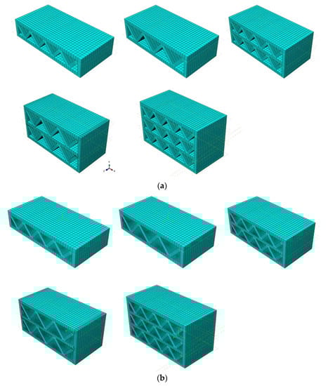 Three-dimensional heat transfer simulation considering steady-state and laminar airflow was performed to calculate the U-value of the 3DPC walls. The wall configurations were designed using ANSYS software and the models were validated against the thermal analysis on numerous cavity arrangements of hollow concrete bricks performed by Henrique dos Santos et al. [39]. Neumann–Dirichlet type boundary conditions were used as two parallel surfaces were considered adiabatic at different temperatures, creating a perpendicular heat flux to those surfaces possible. The Discrete Ordinate Radiation Model (DORM) was applied to determine the radiative heat transfer inside the air cavities. The mesh was created with 3 mm edge length cubic elements.