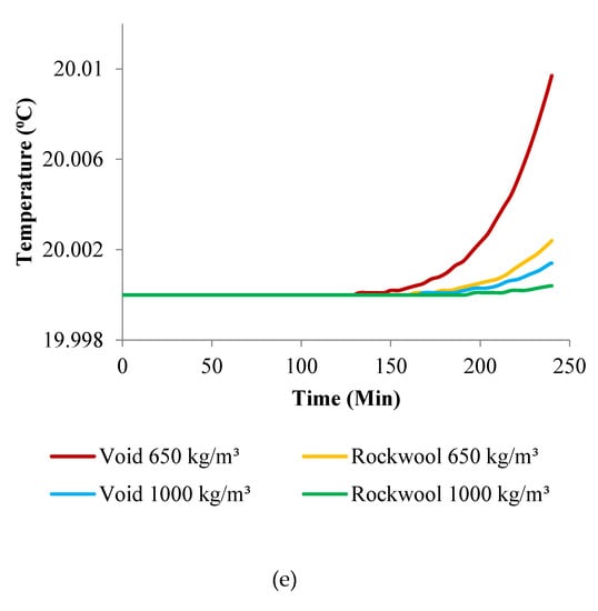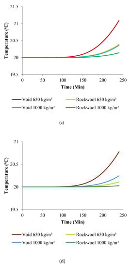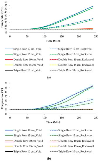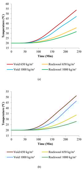 Figure 8a,b illustrate the unexposed surface temperature variation for all five considered wall configurations with densities 650 kg/m3 and 1000 kg/m3, respectively. Increment in insulation fire rating with the increase in density is clearly identified for all the wall panels. Both the cavity and Rockwool infilled walls showed superior fire resistance such that insulation fire rating is not exceeded the limiting insulation fire rating temperature of 160 °C (140 °C + 20 °C) for all the wall configurations within four hours. Moreover, it is obvious that the temperature increment is very low for the wall configurations with double row and triple row.