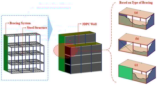 Moreover, with the aim of developing cost effective sustainable buildings with enhanced structural performance and with increased construction speed the following MBS with 3DPC walls with improved thermal energy and fire performance could be proposed. Figure 10 shows one of the proposed 3DPC walls in MBS and Figure 11a,b illustrate the recommendations on how to integrate 3DPC walls around SHS corner posts in steel construction. The configuration shown in Figure 11a illustrates the arrangement of steel corner posts with 3DPC walls. This could be used to protect the steel elements from fire source inside the building which is also easy to install onsite. The in-situ installation of the configuration given in Figure 11b would be a challenge since the corner post t integration with printing process. However, it could be used to protect the steel elements from fire inside the building, as well as external environmental and chemical factors.