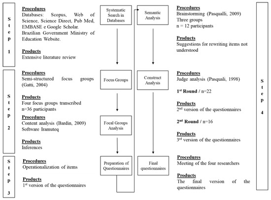 Thus, the development of the instrument was based on the model described by Pasquali [43]. The theoretical procedures respected the following steps: (i) systematic search in the databases; (ii) conducting and analyzing focus groups; (iii) questionnaires development; and (iv) questionnaires analysis (Figure 1).
