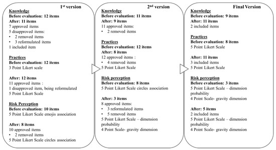 From the information obtained with the previous steps, the first version of the instrument was prepared. The questions were distributed among the three dimensions: 12 items of knowledge, 12 practice items, and 10 risk perception items.