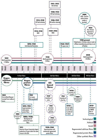 As we seek to understand the rise and fall of these fibres, it is necessary to investigate the relevant influencing factors: (1) The socio-political landscape of the time; (2) advances in technology; and (3) the way in which each fibre was marketed and presented to consumers. Through her own historical investigation, Brooks [20] also identifies three possible generations of RPFs, each developed in response to varying economic, political and social factors. The first were created between the mid-19th century and early 20th century, the second in the mid-20th century, and the third in the late 20th and early 21st centuries. Building upon this concept, a fourth generation will be identified to focus on fibres created in the 21st century and analyse the potential for a new range of fibres, created in response to excessive consumption over economic hardship.