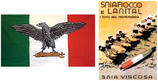 (Left) Italian fascist party flag made from Lanital; (Right) SNIA Viscosa advertising for Sniafiocco (viscose) and RPF Lanital (‘I tessili dell’Indipendenza’, translation: ‘The textiles of Independence’).