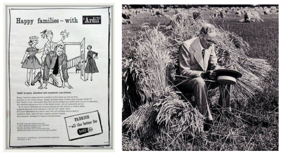 Despite the quality of RPFs produced, efforts were put into their promotion and advertisers were likely to put a positive spin on their properties. This was especially the case after the war when their popularity was in decline and can be attributed to the initial expenditure that was put in by companies and governments. In 1945, The UK government invested £2.1 million to produce a new factory in Dumfries [47] for their RPF Ardil manufactured from waste peanuts, shortly after a marketing campaign was launched in effort to increase product popularity (Figure 3, left). Indeed, even Henry Ford attempted to increase the popularity of RPFs; the Ford motor company pushed for the inclusion of soy protein fabrics in their cars through research at the United States Soybean Laboratory and produced a patent detailing their work [48]—Ford even went so far as to model a soy-protein suit (Figure 3, right), although it was said to have been itchy and uncomfortable to wear. As with other RPFs, the end of WW2 in 1954, along with the accompanying reduction in international wool prices due to ease of trade, led to a loss of interest in soy fibres [40].